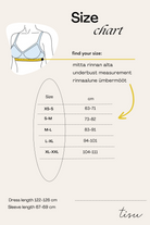 Vali kleidi suurus selle järgi, mida sa tavaliselt ülaosas enne rasedust kandsid. TISU raseduskleidi alumise osa lõige annab kõhule piisavalt kasvuruumi. Vaata TISU raseduskleidi suuruste tabelit, et leida endale sobiv suurus!
