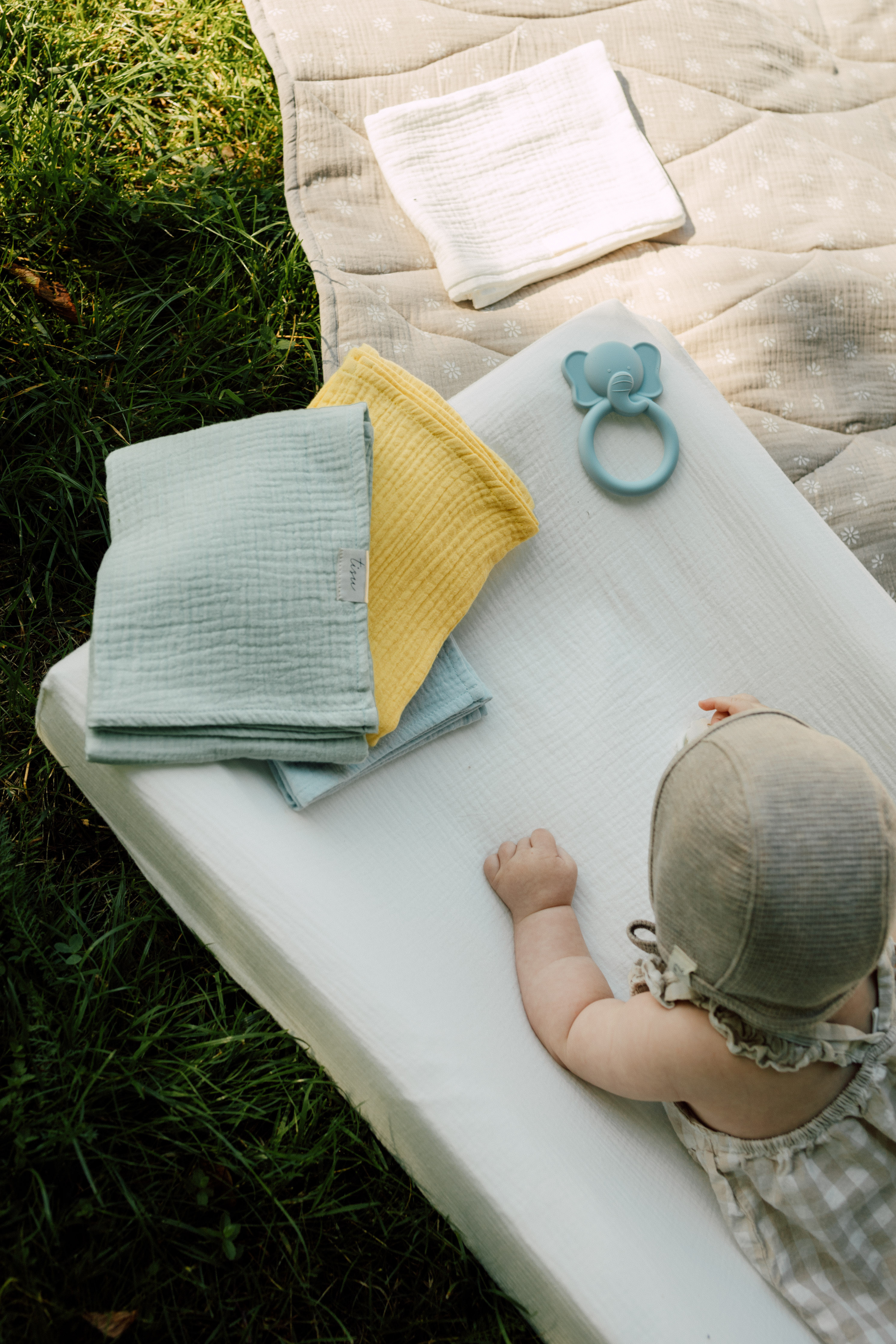 TISU mähkimisaluse kate on valmistatud pehmest ja hingavast musliinist. Aluse kattel on mugavad kummipaelad, nii et seda on lihtne mähkimisalusele panna ja see püsib kenasti paigal.
